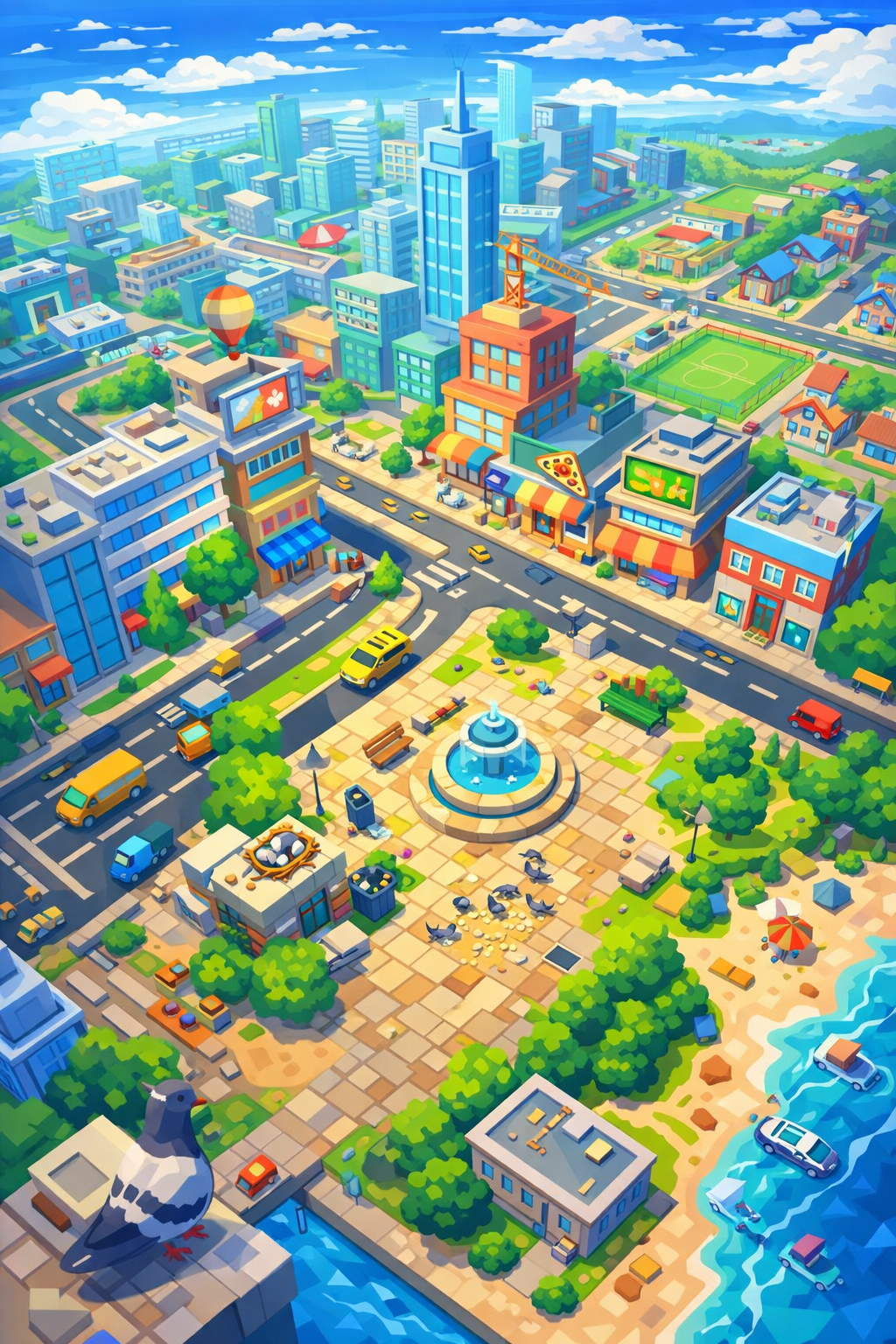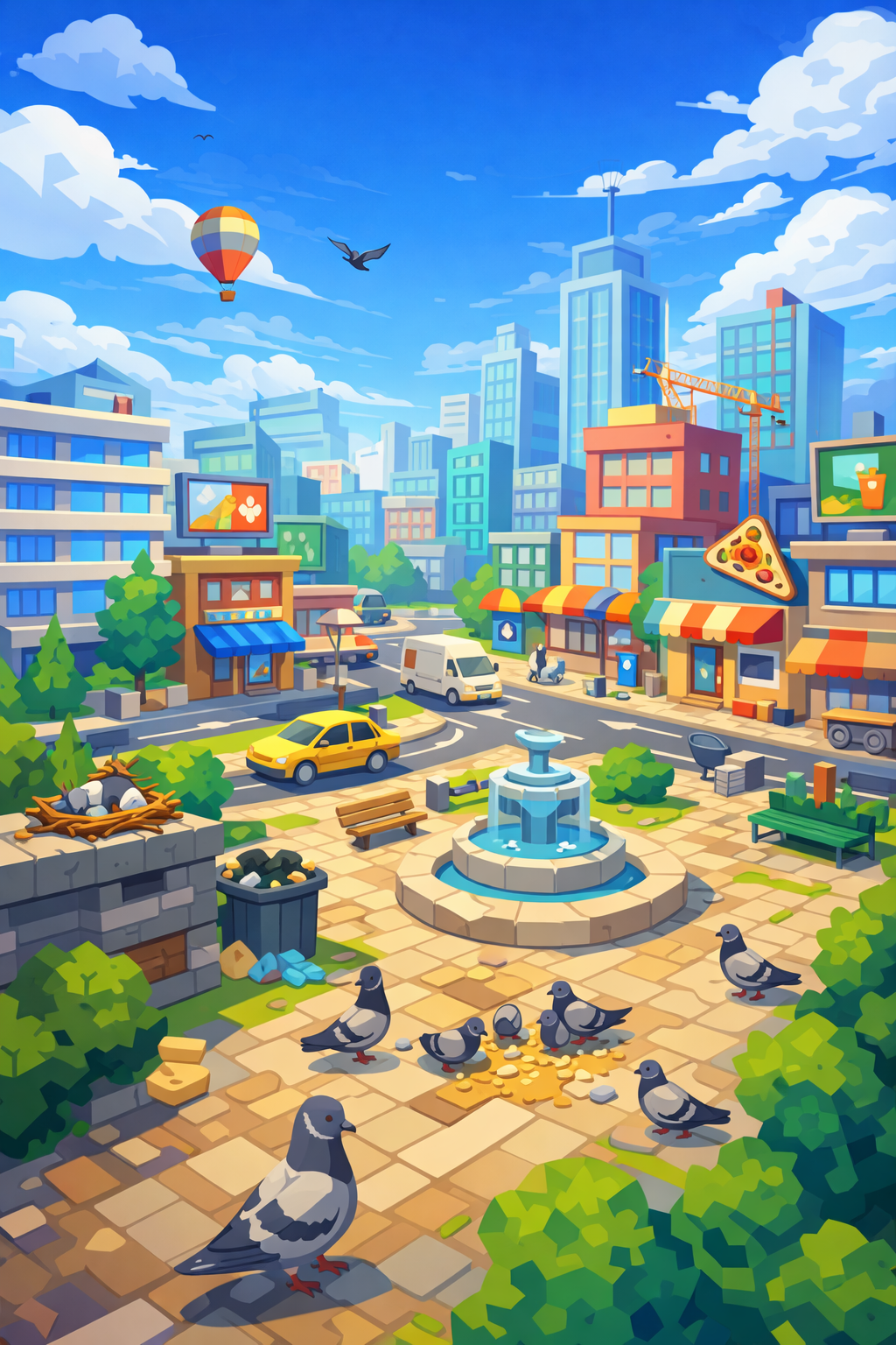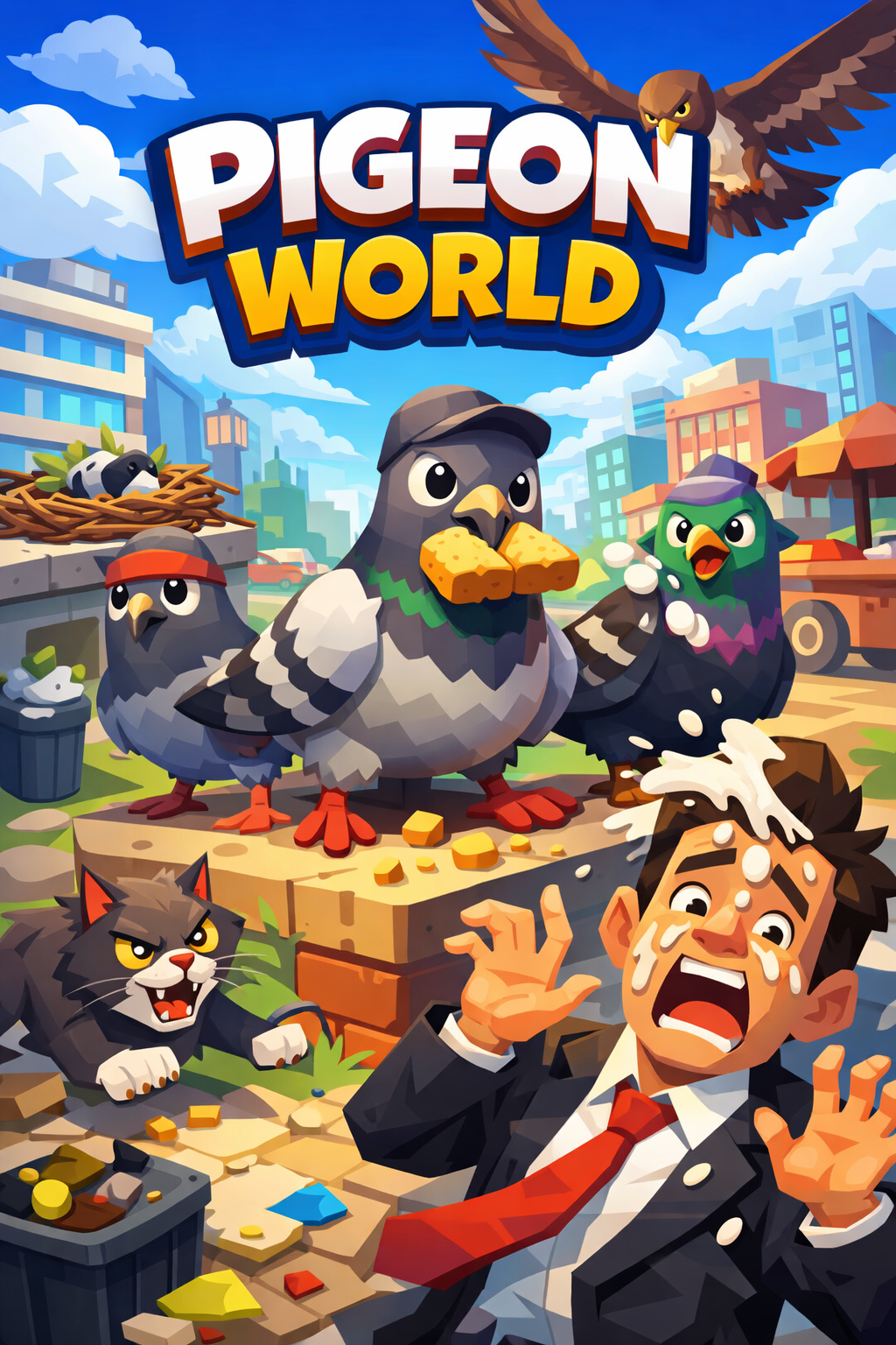 A multiplayer sandbox where players are urban pigeons surviving in a vibrant city. Compete for food, evade predators, build nests, and score points with mischievous actions like pooping on things. Embrace the pigeon life: scavenge for crumbs, fight for territory, and turn every statue into a target.